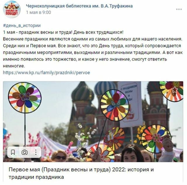 Чернохолуницкая сельская библиотека им. В.А. Труфакина в рамках празднования 1 Мая - Дня всех трудящихся предложила вниманию пользователей экскурс в историю значимой для каждого россиянина даты, в ходе которого были представлены историческая справка праздника весны и труда, организация демонстраций с лозунгами, транспарантами, шарами, объёмными цветами, народные приметы, традиции празднования 1 Мая в мире.