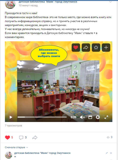 В целях популяризации своей деятельности, привлечения новых пользователей Детская библиотека «Маяк» на страничке соцсети «ВКонтакте» разместила видео-экскурсию раскрывающую свою многогранную деятельность. В современном мире библиотека- это не только место, где можно взять книгу или получить информационную справку, но и принять участие в различных мероприятиях, конкурсах, акциях и викторинах.