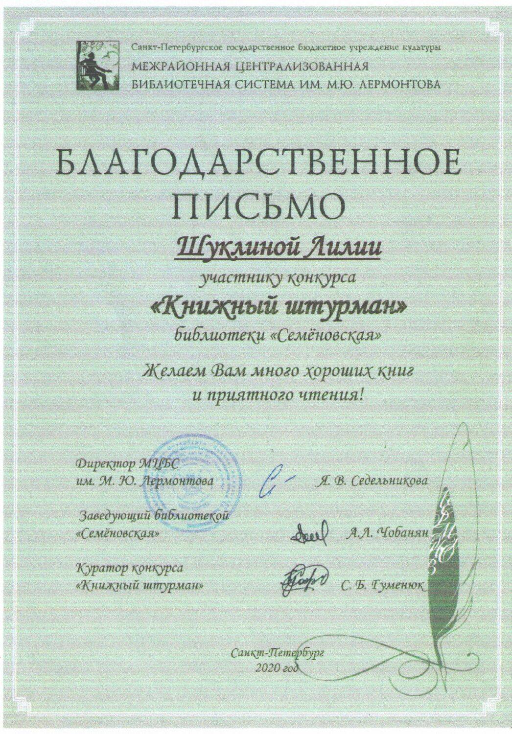 Сестры Плотникова Татьяна, Киселева Алла, Шуклина Лилия приняли участие в конкурсе читательских рекомендаций «Книжный штурман», организованном Санкт-Петербургским государственным бюджетным учреждением культуры «МЦБС им. М.Ю. Лермонтова» – Библиотека «Семёновская». Цель конкурса - поддержка творческих инициатив читателей, направленных на продвижение библиотеки как социального института, создающего условия для общения между посетителями и обеспечивающего широким выбором современной и классической литературы разных жанров. Конкурсантки представили рекомендации литературных предпочтений - рецензии на книгу Сатьи Дас «Женщина и ее божественная природа», поэтический сборник вятского поэта Степана Лукиянчука «Мне б от мира укрыться», роман Захара Прилепина «Обитель». За активное участие в конкурсе песковчанок поощрили Благодарственными письмами.